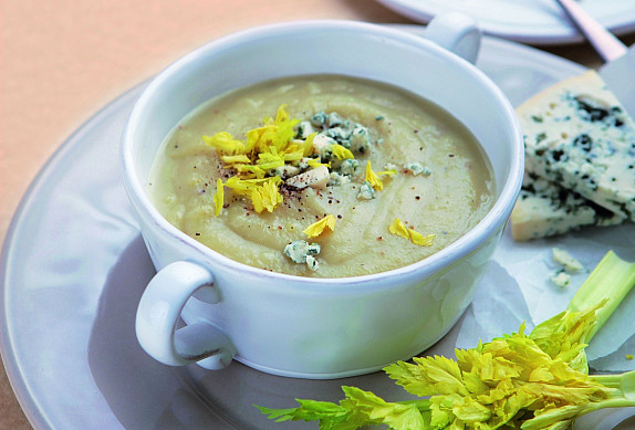 Asi po 10 minutách přidejte na kousky nakrájený řapíkatý celer a nechte ještě 5 minut vařit. Odstavte a rozmixujte na hladký krém. Ozdobte celerovou natí, mixem semínek a rozdrobeným modrým sýrem.