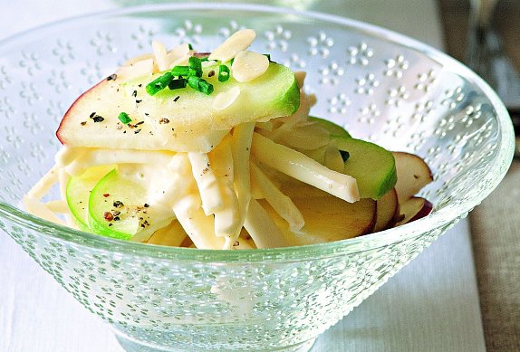 Jablka zbavená jádřinců nakrájejte na velmi tenké plátky. Pokapejte je zbylou citronovou šťávou. Do misek rozdělte plátky jablek a celer naložený v majonéze s jogurtem. Posypte najemno nasekanou pažitkou a plátky mandlí.
