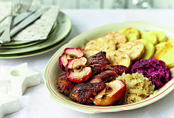 Pečená kachní prsa podávejte s jablky a variací knedlíků a zelí.