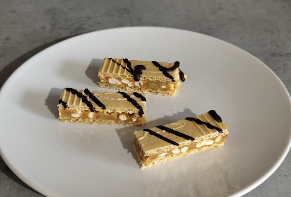 Ja dávám trošku méně ořechů a přidám neslazené burisony. Do oplatků dáme karamel asi 0,8 mm, mírně zatížíme a necháme zatuhnout. Krájíme na tyčinky 4x1 cm. Můžeme polít čokoládou.