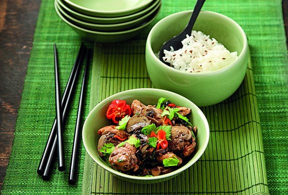 Rychlé jídlo, které chutná jako z asijské restaurace. Kombinace lososa v marinádě ze sójové omáčky, limetky a chilli papriček s restovanými žampiony a listy řepy je neobvyklá, ale dodává jídlu barvu i nečekaný šmrnc.