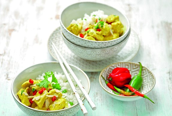 Mezitím nakrájejte kuřecí prsa na kousky. V hlubší pánvi zahřejte olej, přidejte nasekanou cibuli a orestujte ji, až zesklovatí. Přidejte maso, osolte ho, opepřete a krátce orestujte. Vmíchejte kari, podlijte troškou zeleninového vývaru a duste doměkka. Podle potřeby během dušení přilijte další vývar.
