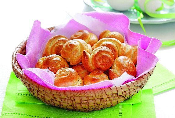 Vzešlé těsto rozdělte na 20 kousků, vyválejte dlouhé válečky a stočte je do spirály, do tvaru šnečí ulity. Moc neutahujte. Přendejte na plech vyložený pečicím papírem, potřete rozšlehaným vejcem, tím spojíte i konce, aby držely tvar.