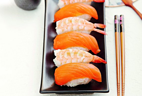 Připravte si lahodné sushi nigiri. Pokud nebudete mít k dispozici krevety ve speciální úpravě na sushi, je nutné je před výrobou sushi očistit, povařit v citronové vodě a vyloupat.