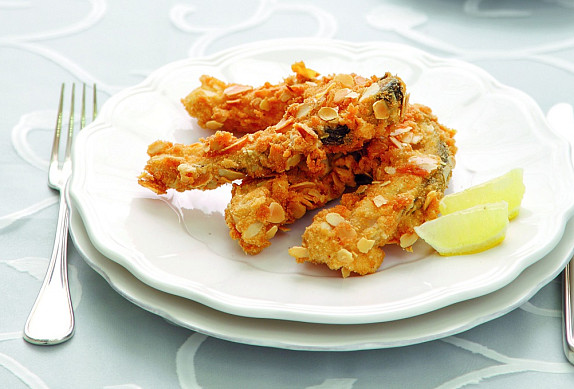 V hlubokém talíři rozšlehejte vajíčka s hladkou moukou na hustější těstíčko. V druhém talíři smíchejte strouhanku a v dlani lehce podrcené mandlové lupínky.