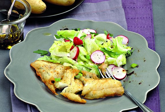 V jednoduchosti je krása a tahle treska s bramborami a salátem s lehkým dresinkem tomu přesně odpovídá. Chcete-li jídlo ještě víc vyšperkovat, rybu můžete dochutit bylinkovým máslem.