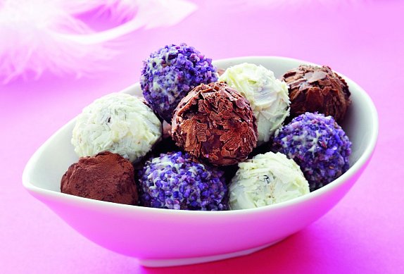 Malinovo-pepřovou směs ponořte do tmavé čokolády a obalte v čokoládových hoblinkách (mohou být z bílé i tmavé čokolády). Směs s tmavým rumem namáčejte v hořké čokoládě a obalujte v tmavém kakaovém prášku. Neochucenou směs namáčejte do bílé čokolády a obalujte v sušených fialkách kandovaných v cukru.